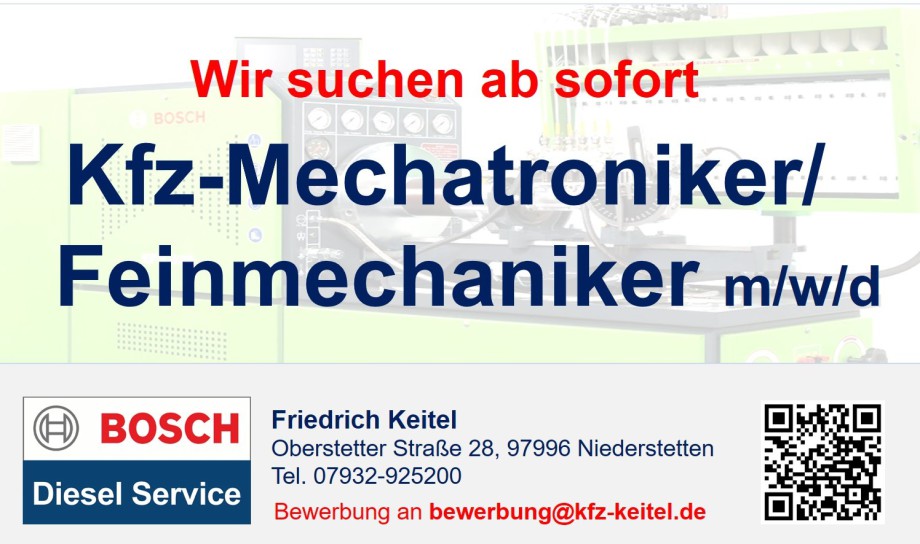 Wir, der Bosch Diesel Service Keitel, ein renommiertes Unternehmen im Bereich Dieselinstandsetzung, suchen einen qualifizierten und erfahrenen Mechaniker, um unser engagiertes Team